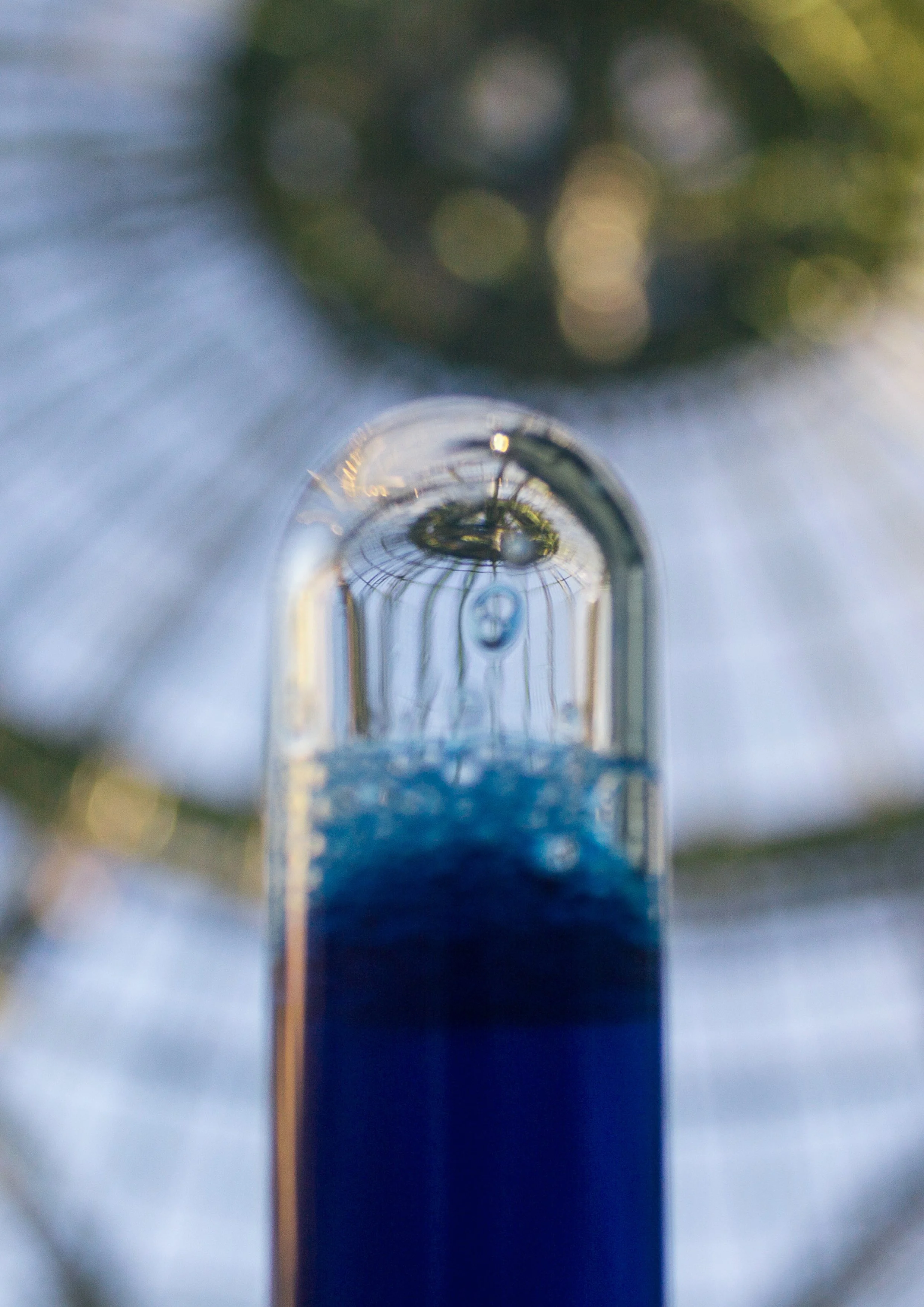 This artwork is composed of eight glass tubes, each containing a distinct hue of blue derived from cyanobacteria. Displayed as a gradient, the tubes reflect the natural biodegradation of the pigment over time — from vibrant saturation to subtle fading. Each tube represents one month in the life of the color, forming an evolving portrait of living matter and its impermanence. «Cyanoscape» is both a material archive and a meditation on transformation — where science, time, and marine life converge in shades of blue.