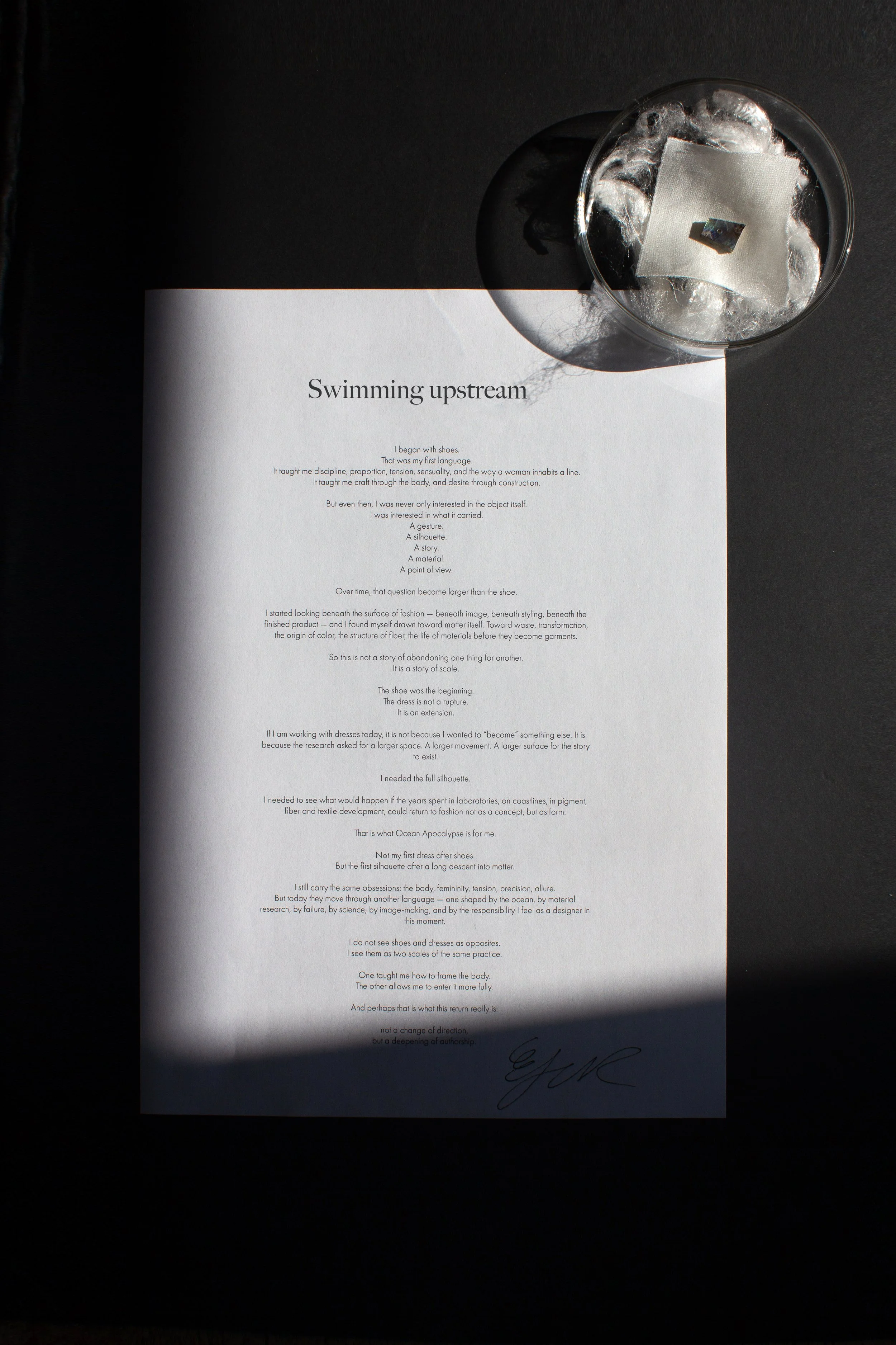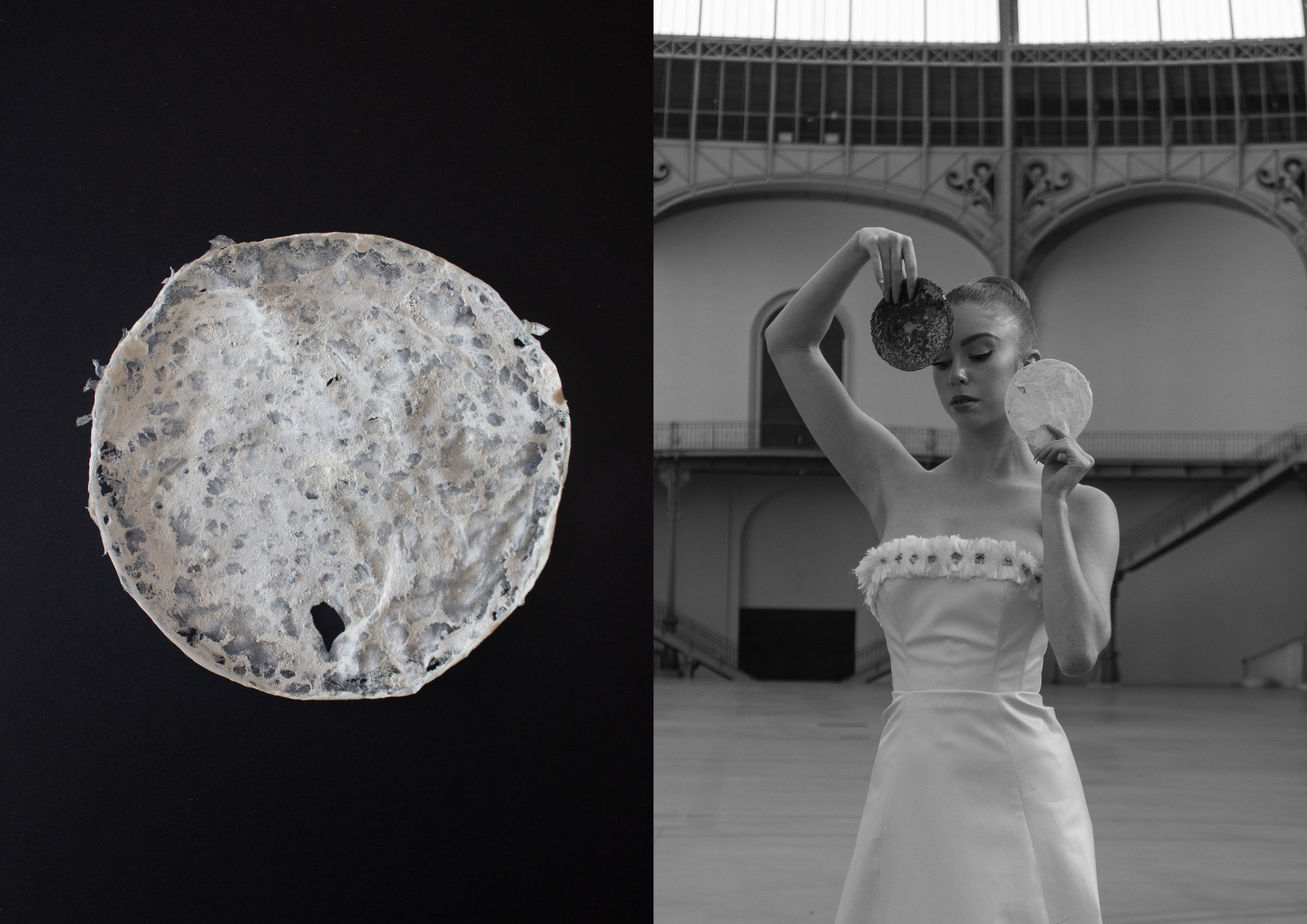 ChangeNOW gave me the keys to an empty Grand Palais, allowing me to express this vision and exhibit works that carry deep symbolic weight for me. It was a childhood dream, but also a tribute to a community that is too often forgotten: fishermen, aquaculture farmers, scientists, and changemakers — the people who help us know and understand the ocean. This photoshoot is dedicated to them. From the ocean to the laboratory, from the lab to the couture atelier, and finally to the Grand Palais. As in my installations I worked with ocean materials, pigments, fibers and textiles, for this special project I carried the same elements forward, some of which transformed into a dress by a haute couture atelier. A project brought to life through the collective efforts of our remarkable team. from seaweed and valorized shellfish byproducts. Thank you to the Grand Palais Rmn. Thank you to ChangeNOW. And above all: thank you to the ocean communities who inspire this work.