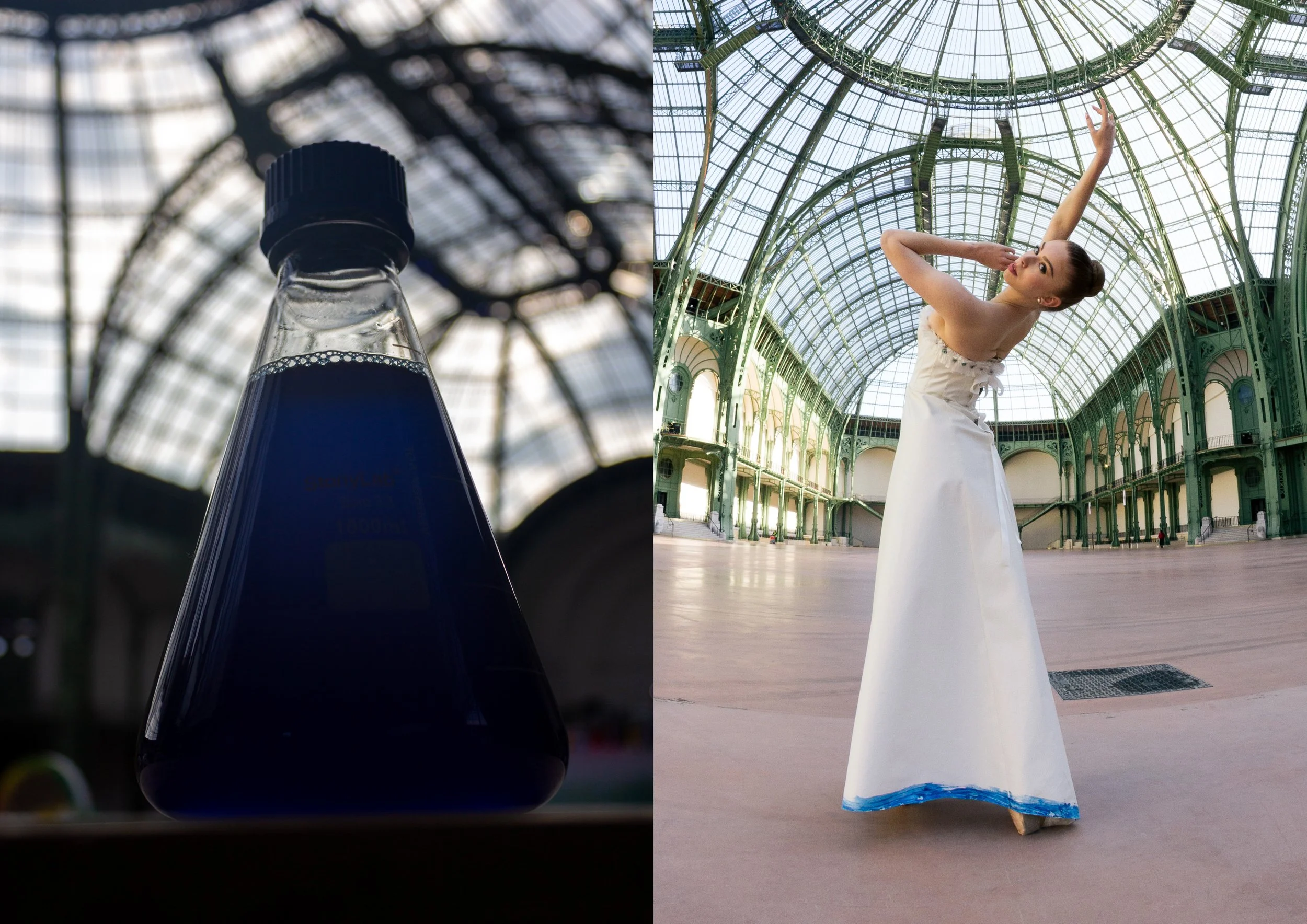 The first couture dress born of marine biomass — transformed through lab science and couture atelier savoir-faire.